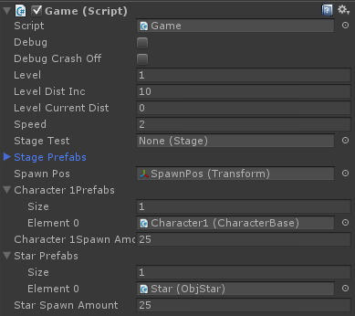 The "Game.cs" script holds all the Stage prefabs to spawn them into the world on initialisation. "Debug Crash Off" allows the player to run forever without crashing into anything (good for testing). "Level" is the level that the player starts on and processes. "Level Dist Inc" is the amount of meters the player has to travel for the "Level" to increase. "Level Current Dist" is the amount of distance the player has travelled (it is public / exposed so you can easily see it). "Speed" is how fast the player will travel through the world and is used in conjunction with the Player scripts Speed Ratio values. "Stage Test" allows you to place a Stage prefab in that position and run the game so that only that particular Stage will be spawned (very good for testing, but don't forget to remove it!). "Stage Prefabs" are the place you need to add all your Stages you want within the game, currently we have added 61 Stages to the game for you to look at how they work and copy. "Spawn Pos" is the gameobject in the world where all Stages will spawn from. This gameobject is found under the "Main Camera" object in the Hierarchy and moves with the player. "Character 1Prefabs" are lists of characters that will be spawned in a pool of characters to be used in "Stage Spawn Containers" when the "Obj Type" is selected as "Character_1". "Star Prefabs" are lists of Stars that will be spawned in a pool of stars to be used in "Stage Spawn Containers" when the "Obj Type" is selected as "STAR". Both the "Character 1Spawn Amount" and the "Star Spawn Amount" should remain high so that the pool doesn't empty and has to wait for another star to become unused to use it on another Stage.