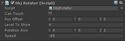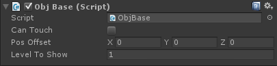 The basic "static" object like a wall uses the "ObjBase.cs" script. This script has a bool that tells the object whether the player can touch it or not (true / false) and the "Level to Show" value tells the Stage Spawning system when this object should be active throughout the game. If it is set to 1 then it is active from level 1, if it is set to 10 then it will not become active till the player has run the distance to make it to level 10.
