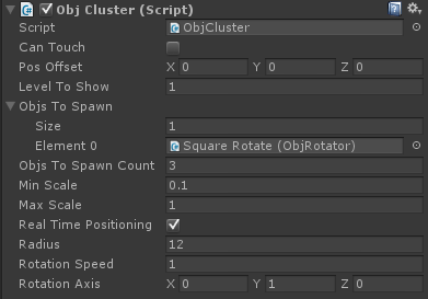 You can add cluster objects that spin around and form circles to your Stage by adding the "ObjCluster.cs" script. The "Objs To Spawn" is the prefab that you want spawned in this cluster. You can add as many prefabs as you like and the ObjCluster script will random spawn from the list you provide. The amount of objects that are spawned into the cluster is handled by the "Objs To Spawn Count". The "Min Scale" and "Max Scale" determines the random size of each spawned object. "Real Time Positioning" enabled will see the cluster of objects rotate and update their positions. "Radius" is the size of the circle of the objects. "Rotation Speed" is the speed in which the circle will rotate and the "Rotation Axis" will determine what axis the clusters is rotated around.