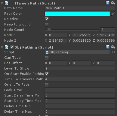 You can add pathing objects to your Stage by adding the "ObjPathing.cs" script. The Node Count is how many sections of path (or nodes) the object will traverse. You can adjust the path directly in the Unity Editor for each object and then just save the Stage (or Object) prefab out when you are done.