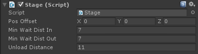 GREEN LINE ( unloadDistance) -> This is the distance the player must run past this Stage before it is unloaded and placed back in the pool of Stages to be used again